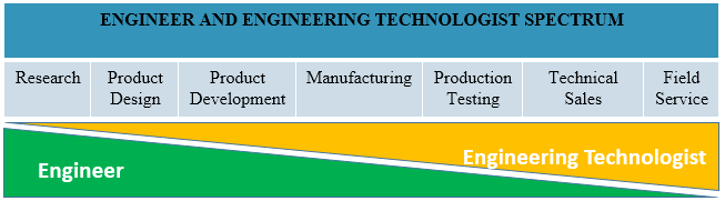 In order to distinguish between engineering and engineering technology, a technological spectrum is used to illustrate the differences. Generally, in an organization, Engineers would most likely work in the design and development fields while Engineering Technologists, Technicians and Craftsmen would be more inclined to work in manufacturing and production line. The Engineers’ role are more towards the left spectrum while the Engineering Technologists are more towards the right of the spectrum although the main activities of both Engineers and Engineering Technologists are in the center of the spectrum. (Cheshier, 1998).